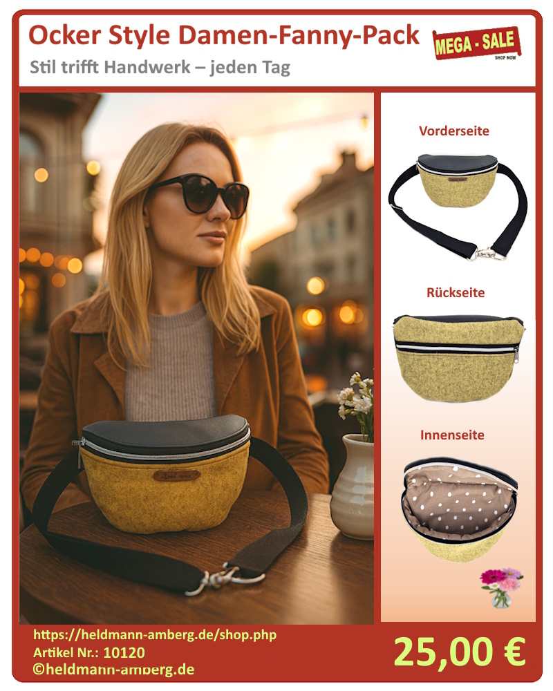 Ocker Style Damen-Fanny-Pack Diese handgemachte Fanny-Pack vereint modernes Design mit sorgfältiger Handwerkskunst. Das Vorderteil kombiniert hochwertiges schwarzes Kunstleder mit ockerfarbenem Filzstoff. Ein silberner Reißverschluss setzt einen eleganten Akzent und verleiht der Tasche eine klare, stilvolle Linie. Die harmonische Materialkombination macht diese Tasche zu einem besonderen Begleiter für Alltag und Freizeit.